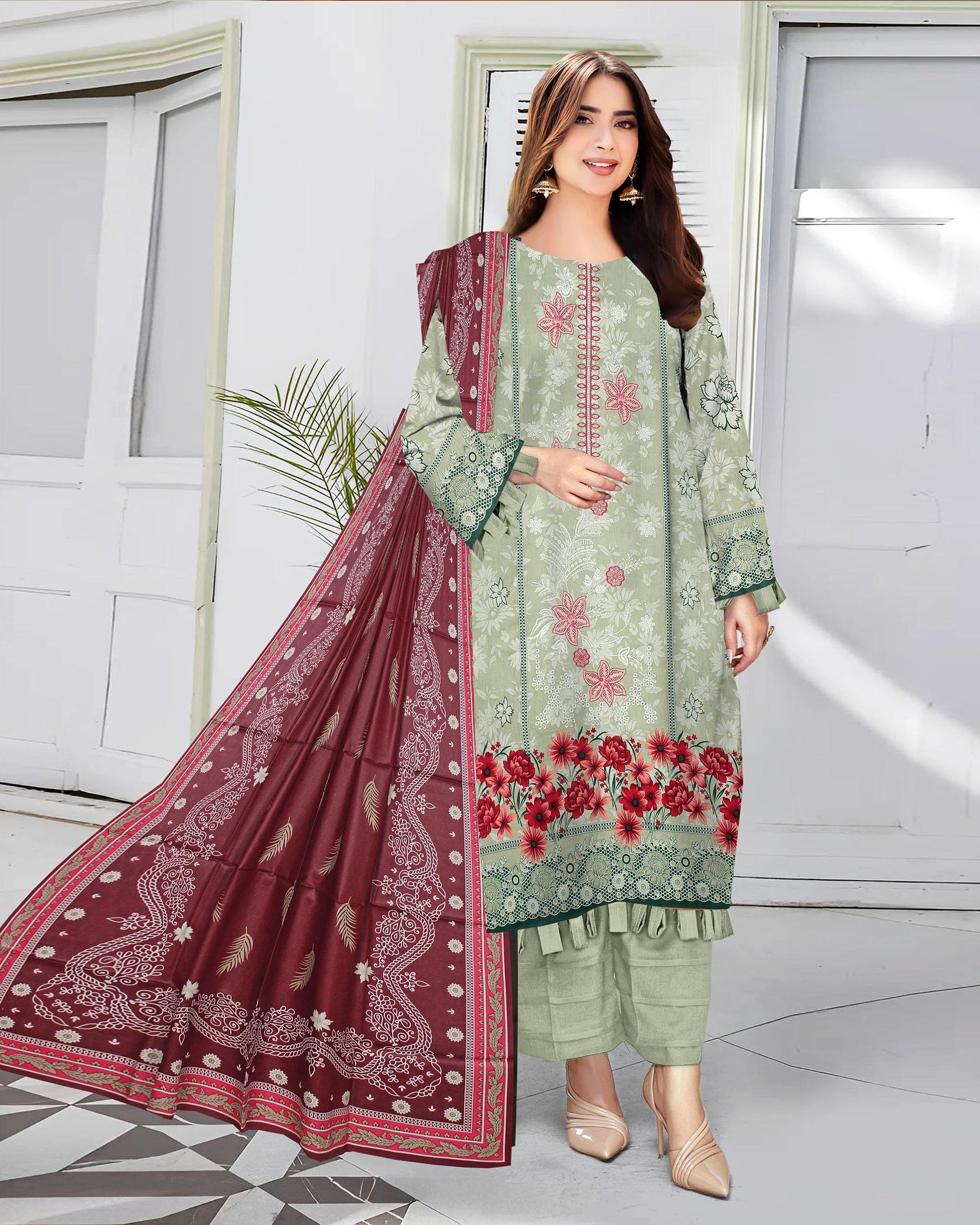 Step into the season with Blush Sage – a harmonious blend of pastel green hues, detailed floral embroidery, and traditional design aesthetics. The vibrant maroon dupatta with classic paisley and botanical motifs adds a rich contrast, while the comfortable trouser and refined shirt keep your look cool and graceful. This unstitched 3-piece suit is perfect for elevating your everyday elegance.