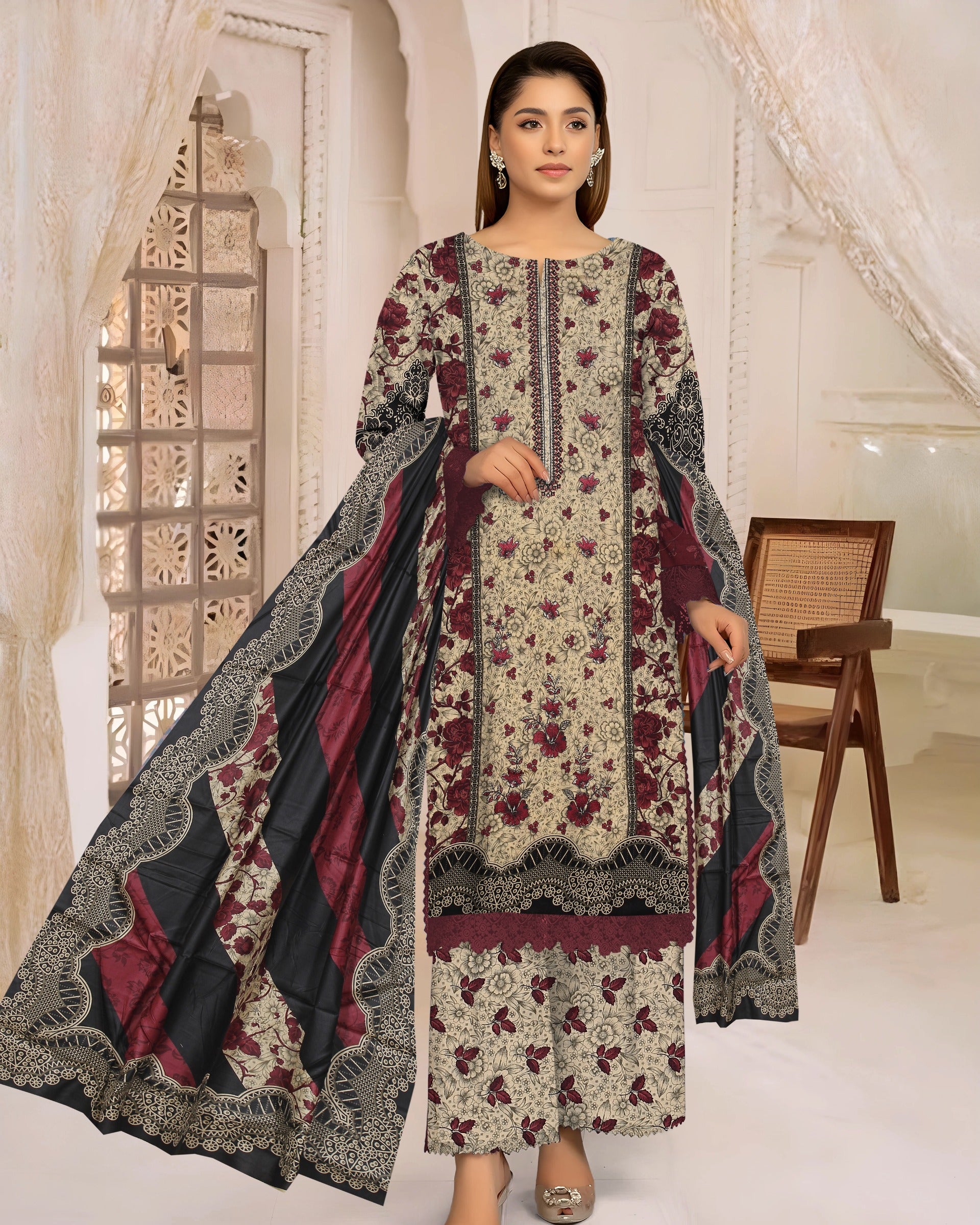 Maroon Mirage – 3-Piece Unstitched Embroidered Lawn Suit