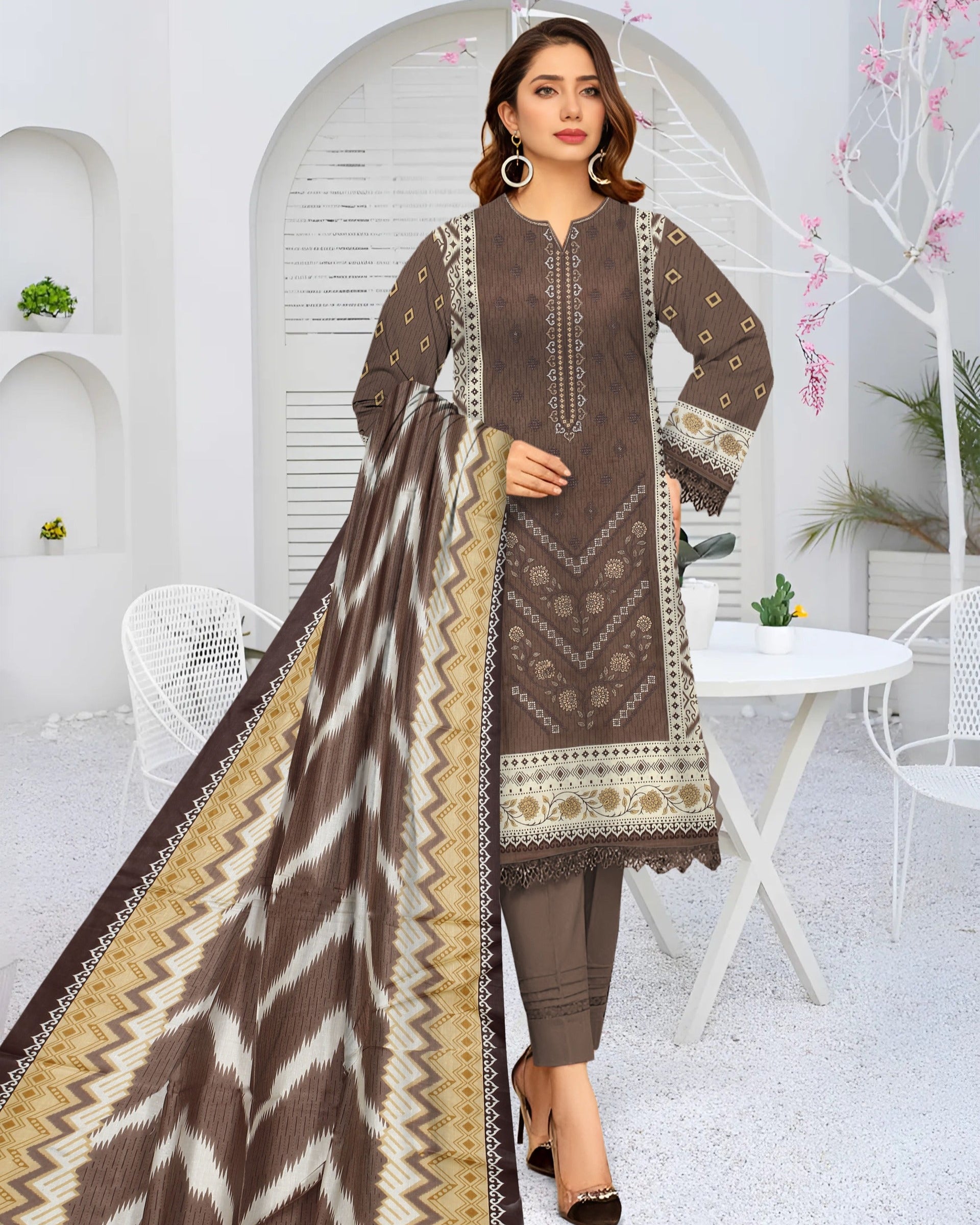 Unveil timeless grace with Sand Dusk – a sophisticated lawn suit featuring intricate embroidery on a deep earthy brown canvas. The zigzag-inspired dupatta brings contrast with tribal patterns in soft beige and ivory, elevating the ethnic charm. Completed with a plain trouser, this 3-piece unstitched ensemble is an ode to understated elegance with a modern twist.