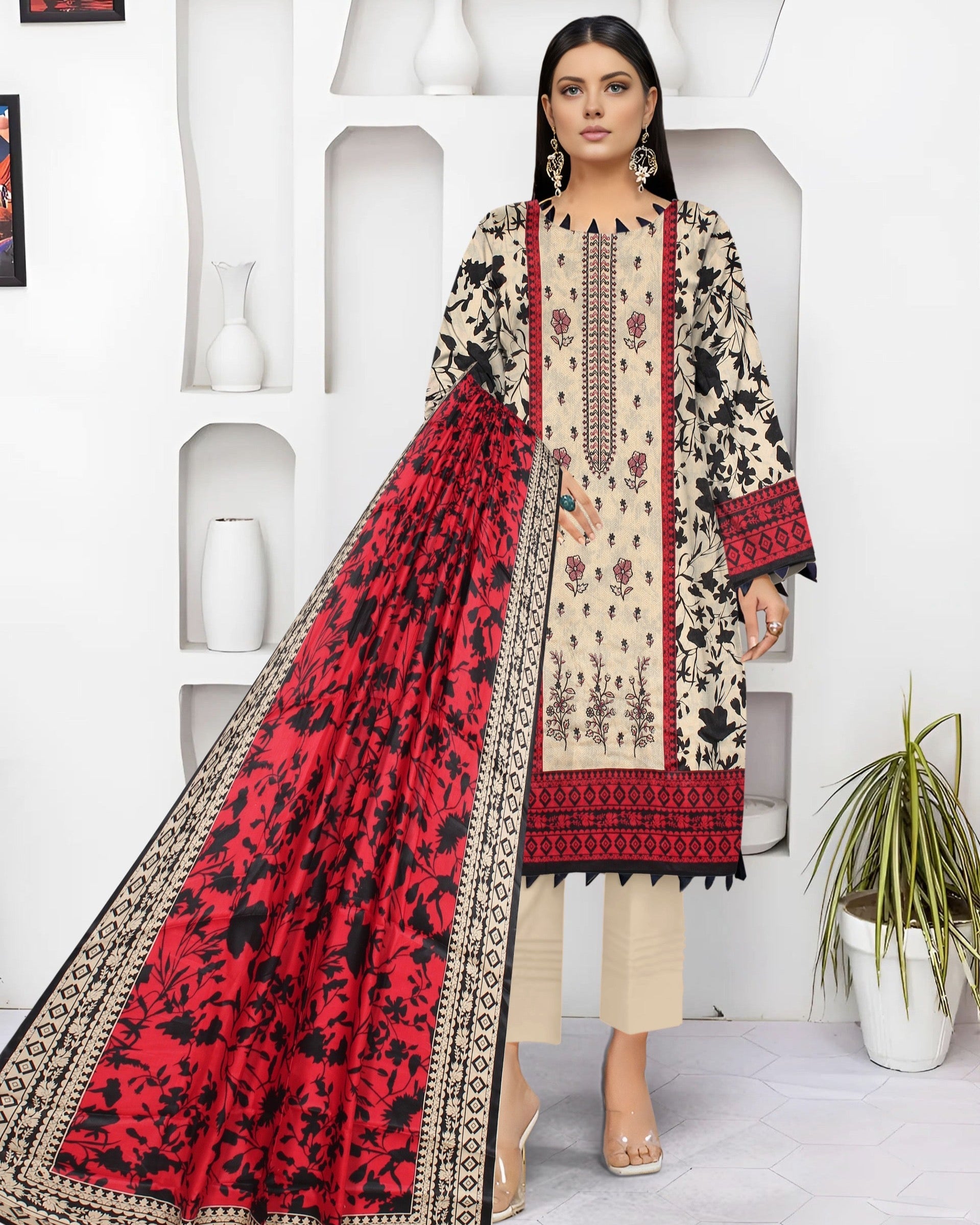 Step into timeless sophistication with Scarlet Dusk – a design that blends classic contrast with intricate artistry. The beige embroidered shirt features floral motifs in deep red and black, framed by refined borders. A bold, flowing red dupatta with black botanical patterns adds dramatic flair, while the neutral trouser grounds the look in modern elegance. This unstitched 3-piece set is perfect for both everyday charm and festive moments.